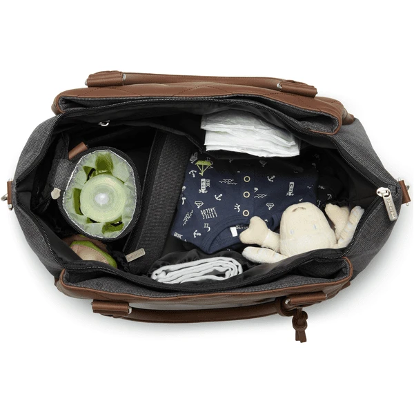 Twee extra buitenzakken, ook met magneetsluiting, en verschillende binnenzakken in verschillende maten zijn ideaal voor de vele kleine dingen die onmisbaar zijn op de weg met de baby. Ook geïntegreerd zijn een hygiënische verschoonmat, een geïsoleerde, afneembare flessenhouder met clip voor bevestiging aan de kinderwagen, een extra opbergvak voor gereedschap en een waterafstotend nat vak.