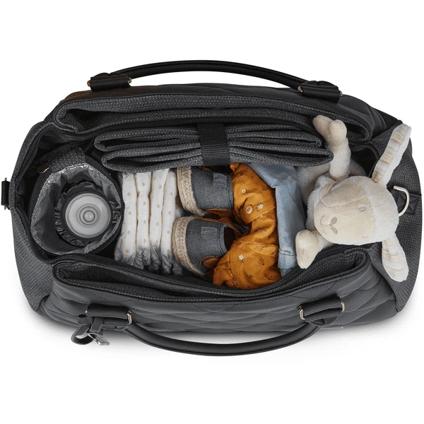 De slimme indeling van de luiertas biedt niet alleen extra opbergruimte, maar ook tal van mogelijkheden om handige gebruiksvoorwerpen veilig en gemakkelijk terug te vinden wanneer u op pad bent. Luiers, natte doekjes, schone kleren enz. kunnen gemakkelijk worden opgeborgen in het grote hoofdvak, dat aan de buitenkant is afgesloten met een rits en een magneet. Twee extra buitenvakken, ook met magneetsluiting, en verschillende binnenvakken in verschillende maten zijn ideaal voor de vele kleine spulletjes die onmisbaar zijn op reis met baby. Ook geïntegreerd zijn een hygiënisch verschoningsmatje, een geïsoleerde, uitneembare flessenhouder met clip voor bevestiging aan de kinderwagen, een extra opbergvak en een waterafstotend nat vak.