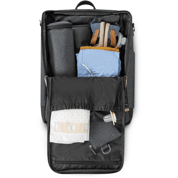 Naast het ruime en grote vak aan de voorkant is de rugzak voorzien van zes andere kleinere en grotere zijvakken – ideaal voor iedereen die van orde houdt. Om ervoor te zorgen dat er geen kleine voorwerpen verloren gaan in het grote geheel, biedt de rugzak kleine zakken met rits en praktische vakken voor creatieve chaos. Er zijn twee insteekvakken aan de binnenkant – inclusief een zak voor natte spullen. Ook inbegrepen zijn een hygiënisch verschoningsmatje voor onderweg, een buidelzakje en een geïsoleerde, uitneembare flessenhouder.