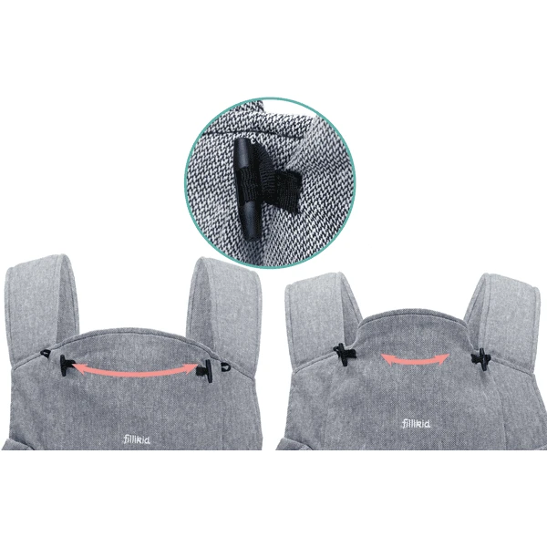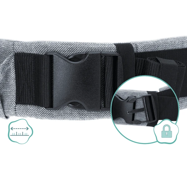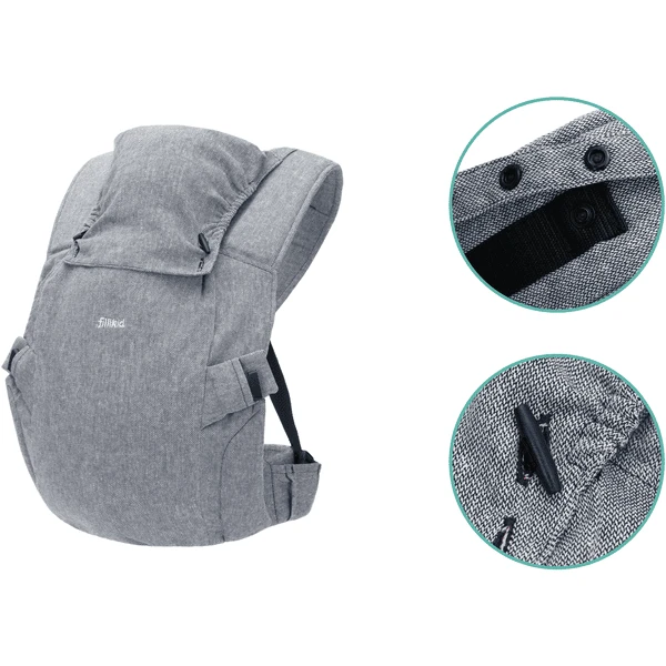 Dankzij de gemakkelijk bereikbare gespen op de heupgordel en op de flappen is de drager gemakkelijk zelf aan te trekken zonder hulp. Een praktische hoofdsteun is inbegrepen, zodat het hoofd van uw kind altijd goed gestabiliseerd is en beschermd is tegen zon en wind. Dankzij het verstelbare ruggedeelte kan het hoofd goed gestabiliseerd worden, zelfs voor zeer jonge passagiers. De buikdrager is getest voor een kindgewicht van 3,5 kg tot 20 kg en wij raden u aan aandacht te besteden aan de individuele ontwikkeling en grootte van uw kind.