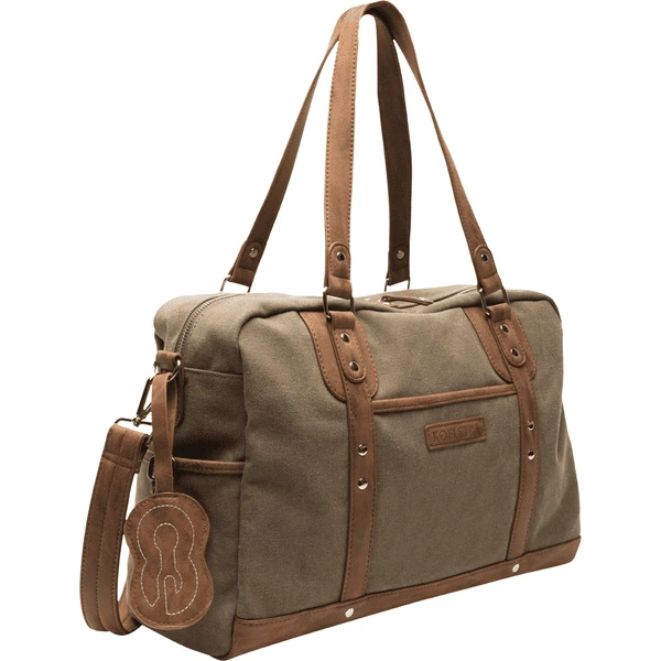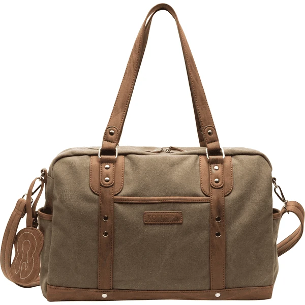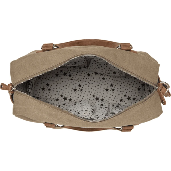 De Nenne luiertas is zeer aantrekkelijk afgewerkt in canvas en met kunstleren accenten. Het heeft een grote, praktische treklus en een groot vak met ritssluiting aan de achterkant.