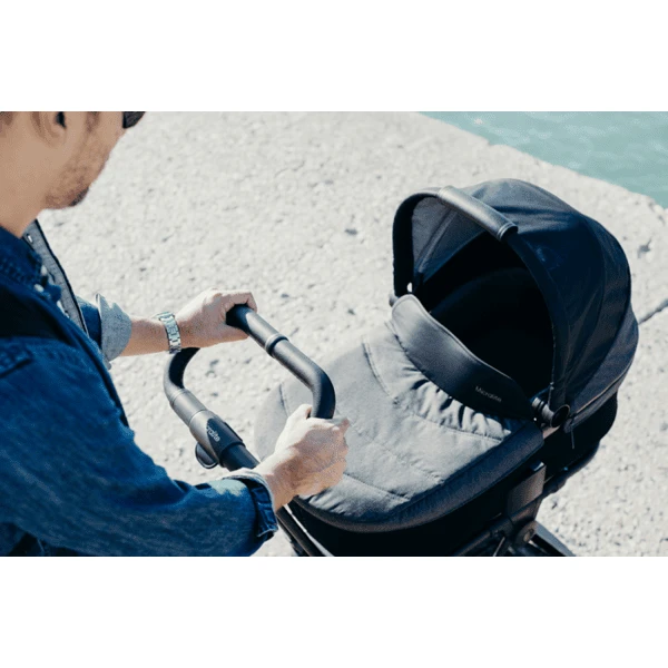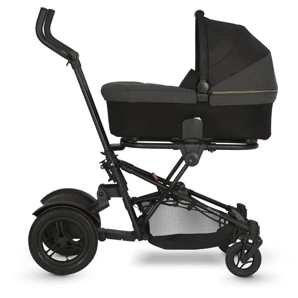 Zo snel wordt de TwoFold een sportieve kinderwagen voor pasgeborenen: de reiswieg wordt eenvoudig met de adapters aan het frame van de TwoFold bevestigd.