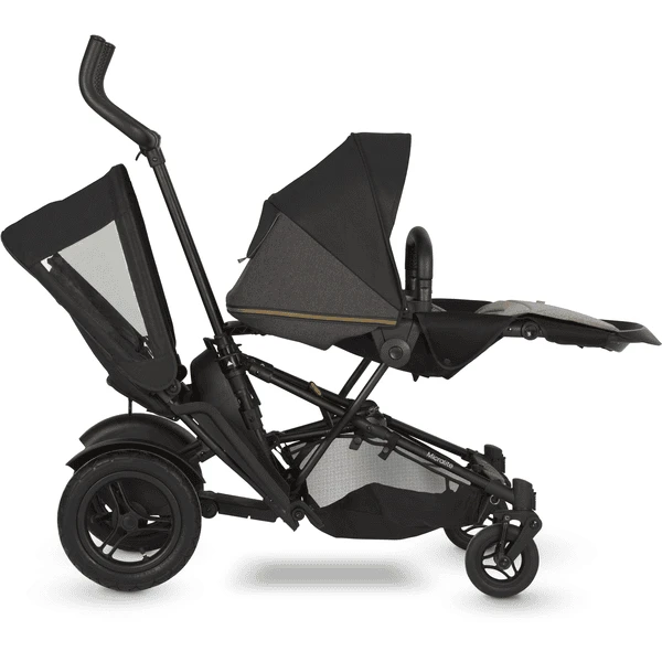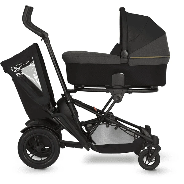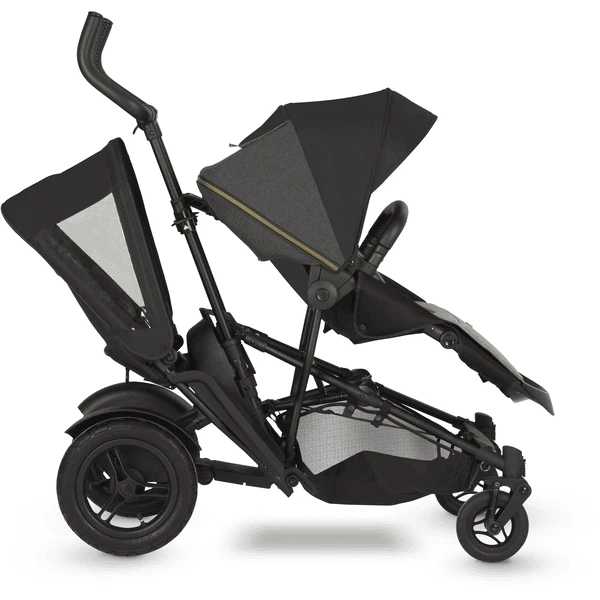 Zo snel wordt de sportieve TwoFold een broer of zus: de tandemstoel wordt eenvoudig op de achterkant van de sportwagen geklikt. Het kan zowel met de bevestiging van de kinderwagen als met het babybadje gecombineerd worden. Zo kunnen twee kinderen zonder meer in de TwoFold zitten.