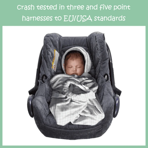 Met zijn stevige handgrepen is hij ideaal om uw baby uit draagzakken en kinderzitjes te tillen zonder dat u uw kind wakker hoeft te maken. De sling Snugglebundl voldoet aan de EU-veiligheidsnormen voor kinderdraagzakken en kinderzitjes en is getest op botsingen met 3-punts- en 5-puntsgordels volgens de EU/VS-richtlijnen. Het wordt aanbevolen door vroedvrouwen, chiropractors, slaapexperts en autostoelexperts.
