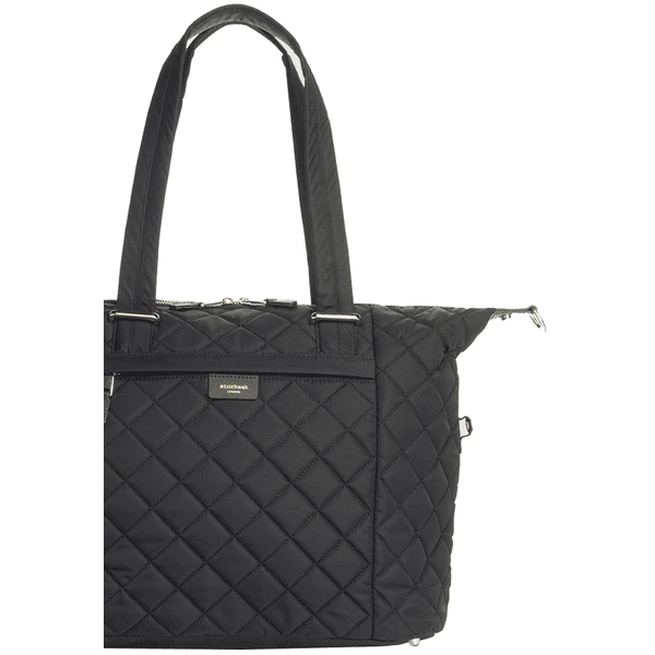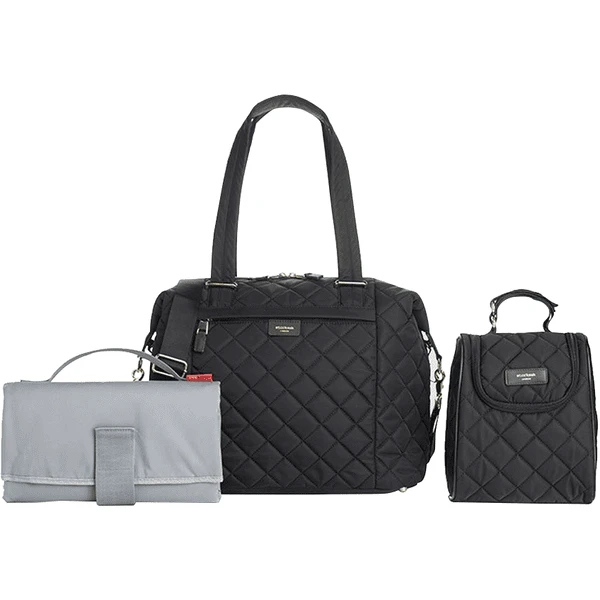Een brede opening die overgaat in een ruim binnengedeelte met tal van vakken waar je al je belangrijkste spullen kunt opbergen, waaronder een luxe en extra grote luierwisselmat met een opbergvak, een thermisch geïsoleerde zak voor etenswaren en flessen en een lange afneembare riem met geïntegreerde, gepatenteerde kinderwagenriemen.